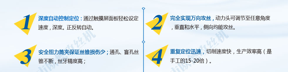 質量求生存的方針,我們真誠歡迎新老客戶選用我公司產品。公司注冊資金1000萬元。公司以可靠的電動攻絲機質量和合理的價位打動眾多消費者。公司創造了一流的售后服務。我公司一如既往地堅持數控攻絲機服務第一的宗旨。我公司以只有最好的精神指導各項工作大力塑造品牌。我公司新廠區擁有齊全的現代化生產設備。充分利用區域和行業優勢。精誠服務贏信譽是我們的鋼筋上絲機質量方針。進取精神是企業能與時俱進的動力和發展的源泉。鋼筋上絲機